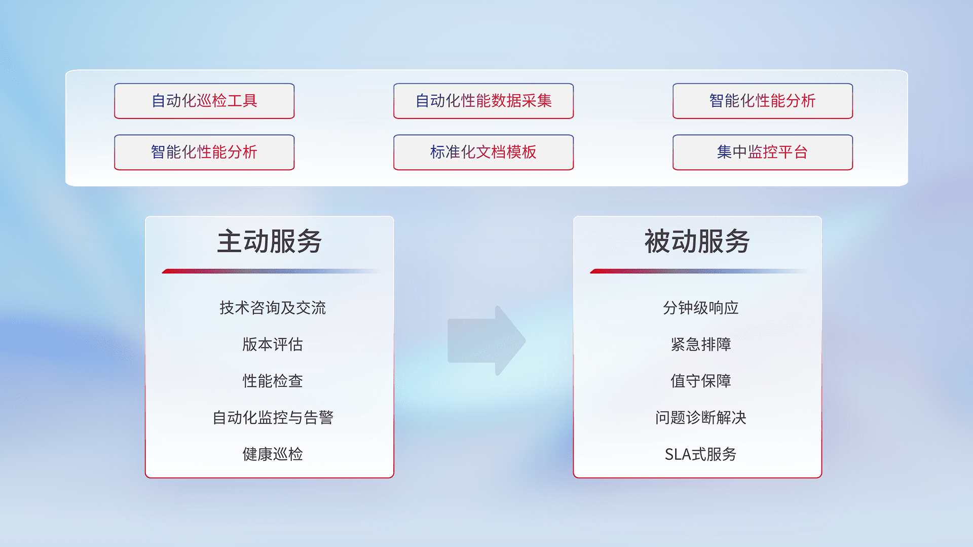智能化工具和标准化文档,,,,保障服务质量,,提供主动服务(包含技术咨询、、版本评估、、、、性能检查、、、、自动化监控与告警、、、健康巡检)和被动服务包含(分钟级响应、、、紧急排障、、、值守保障、、、、问题诊断解决、、SLA服务)。。。。
